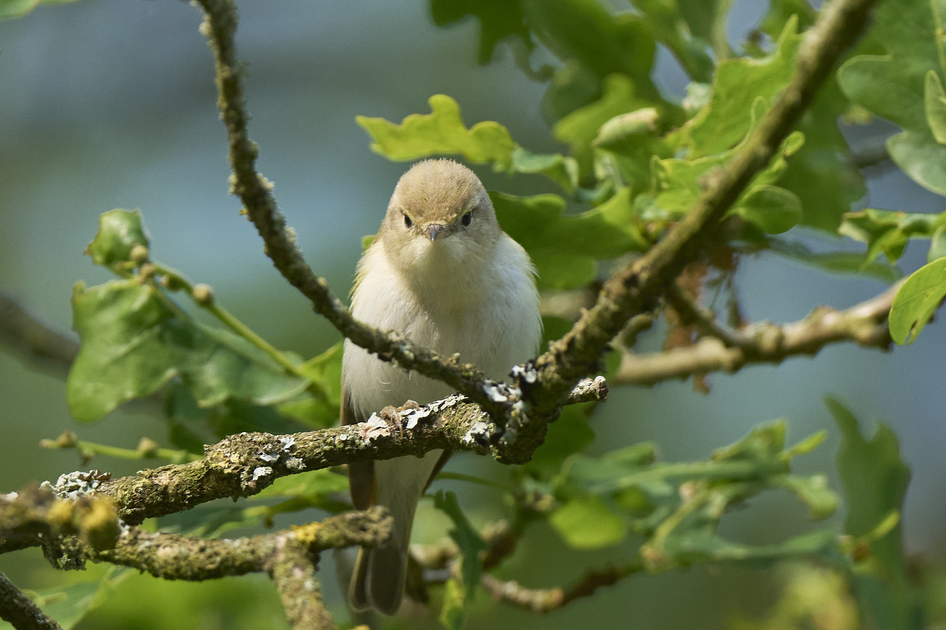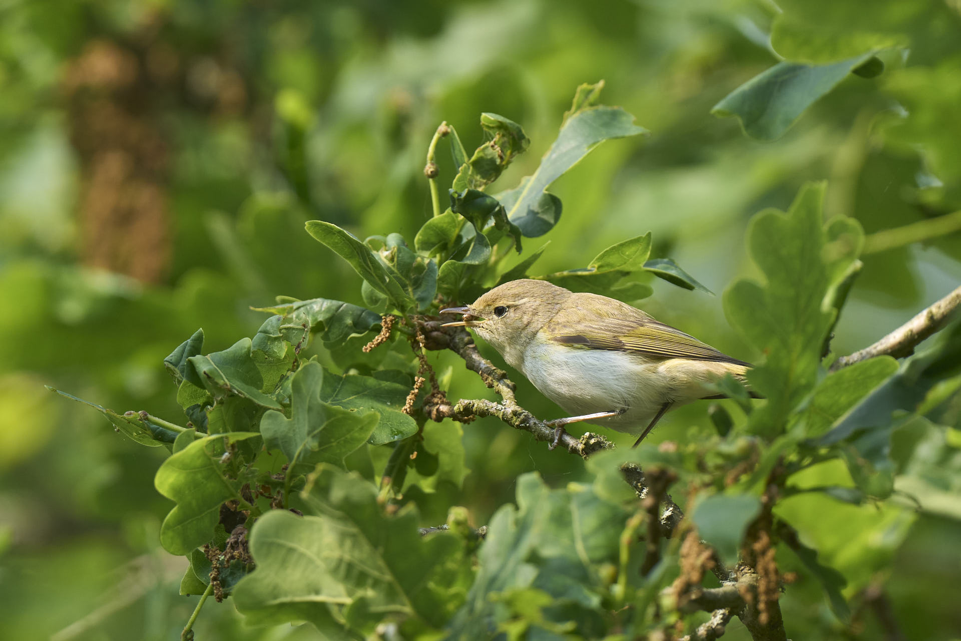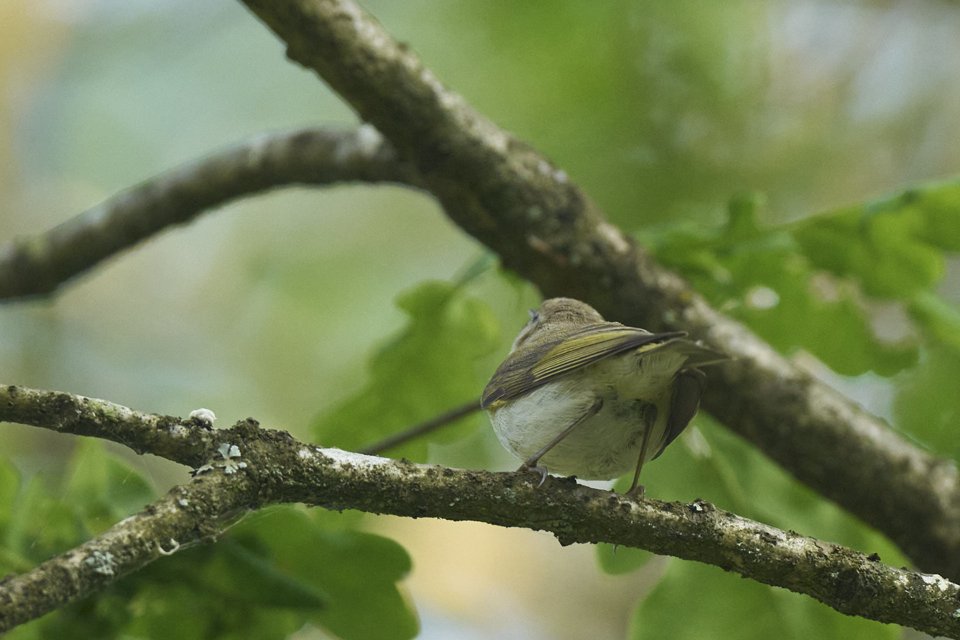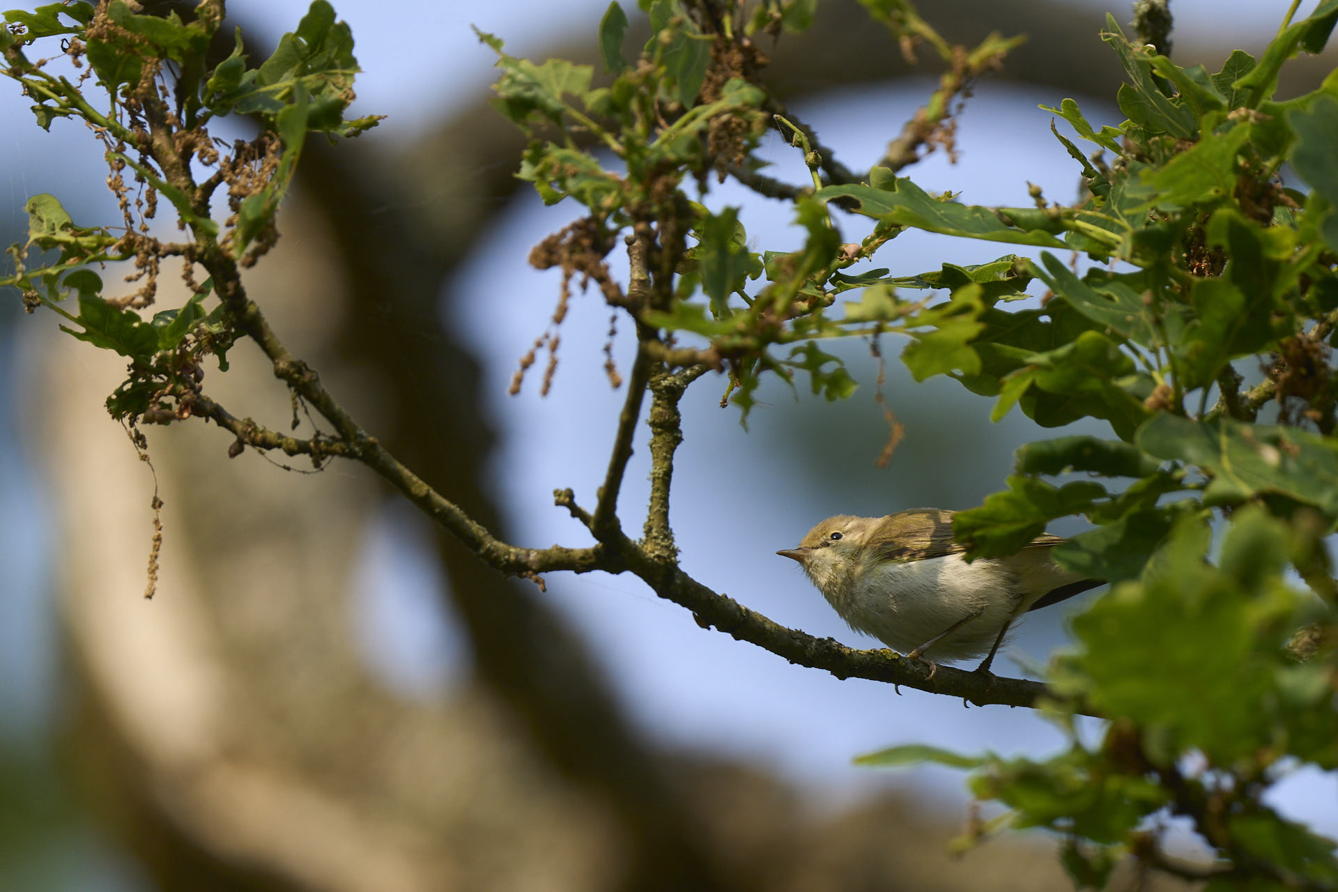 Fuglen vimsede konstant rundt i de samme 3-4 egetræer inden for en heldigvis ganske kort radius. Desværre fouragerede den ofte meget højt i trækronerne, hvor den var ret svær at få øje på. Og når den endelig var kortvarigt synlig, skød man ret så meget opad – som ikke giver de bedste billeder: