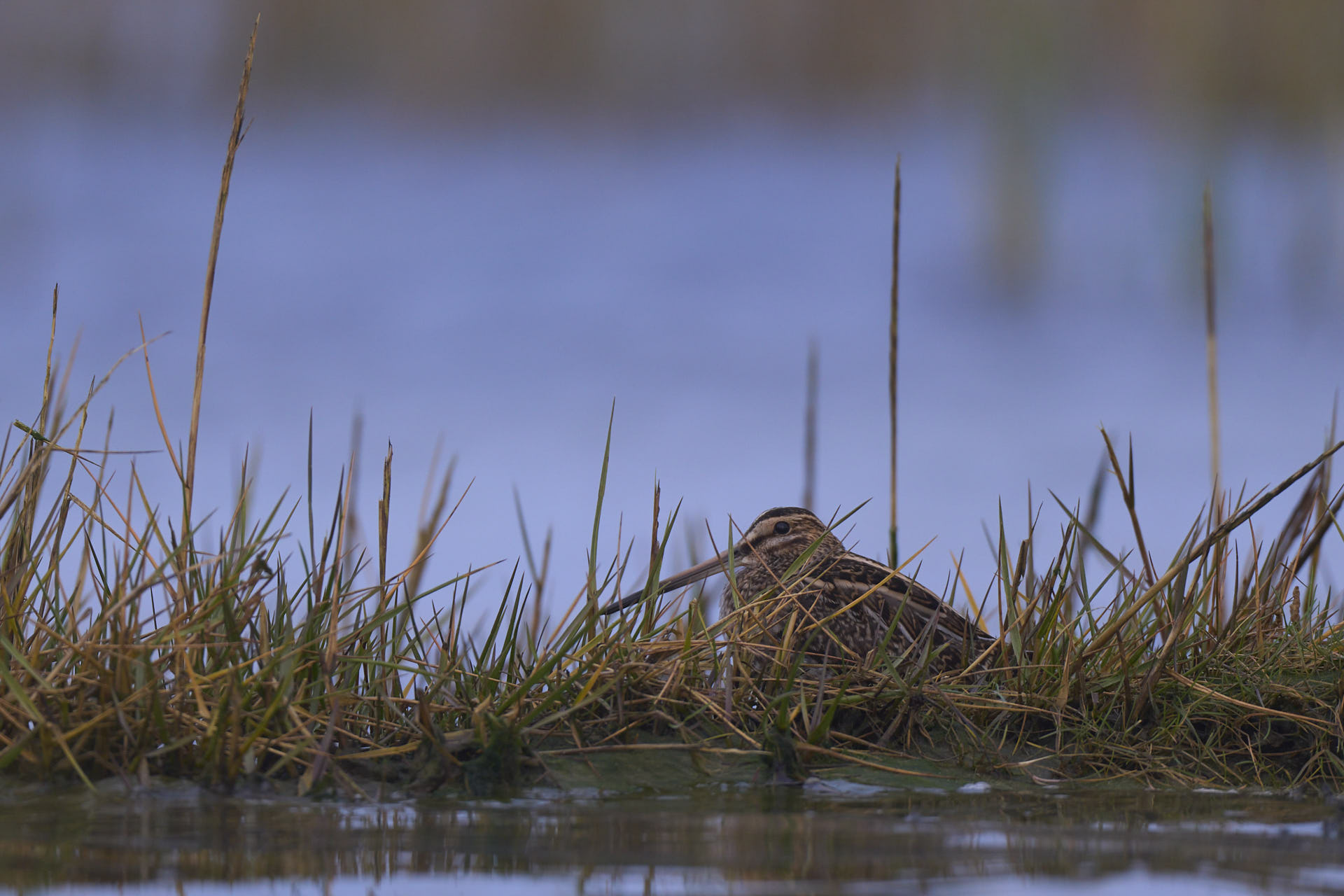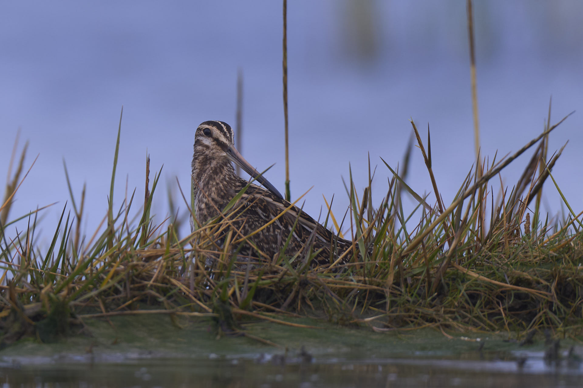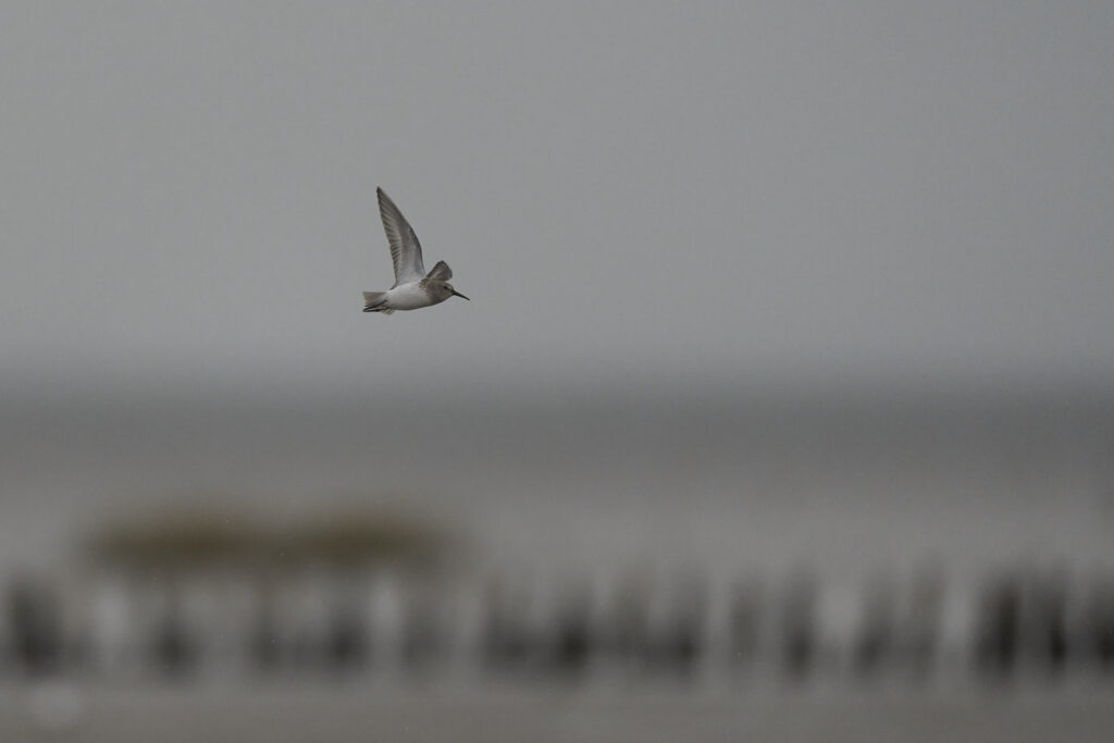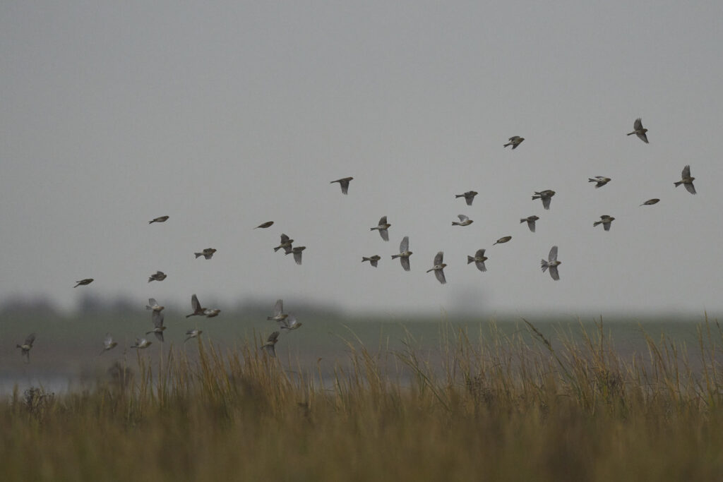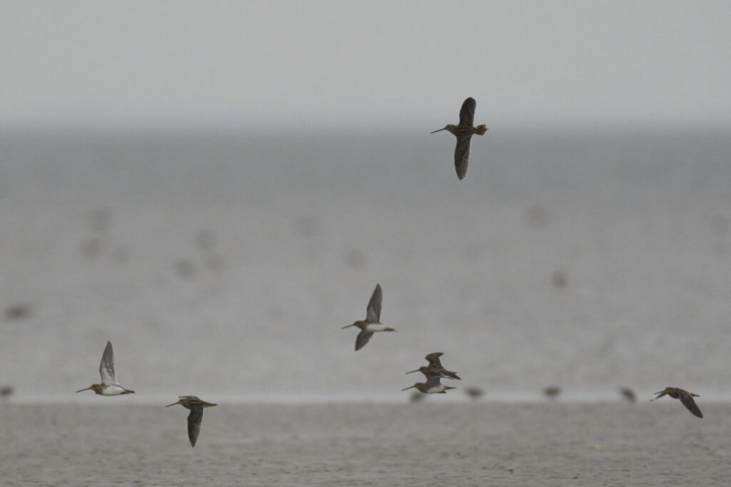 Vejret startede nogenlunde, men kort efter solopgang tog skydækket til. Her flere dobbeltbekkasiner med vadehavet som baggrund:
