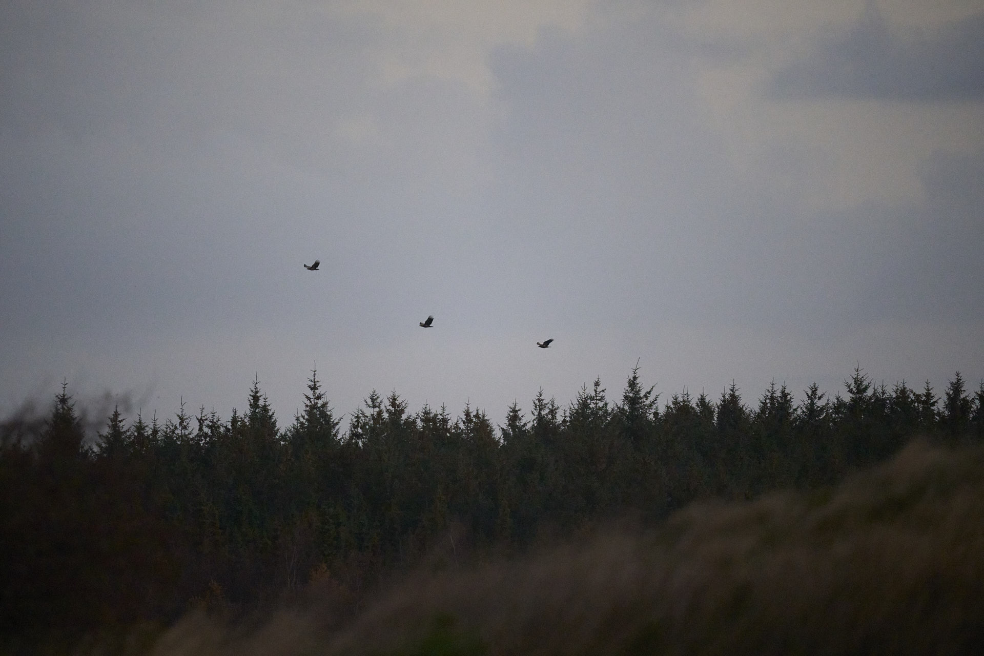 På Dof-basen har sønderjyske fuglefolk indtastet havørne-observationer i massevis den seneste uges tid. Er man morgenfrisk kan de mange natte-rastende havørne i og omkring Tingdal Plantage nord for Højer nemlig opleves omkring solopgang, hvor de i en lind strøm går i luften og flyver mod syd/sydvest. Forleden blev der talt hele 92 ørne på en morgen! Det skulle selvfølgelig prøves, så i morges sad jeg klar ved Galgevej i Sønder Sejerslev tæt på Højer, en vej der ligger højt i landskabet (nok ikke tilfældigt med det vejnavn!) og med et godt overblik over plantagen mod nord. Omkring en halv time før solen kom op, viste den første ørn sig og så kom de ellers i en lind strøm de næste 3 kvarter. Typisk alene eller som her hele 3 på een gang:
